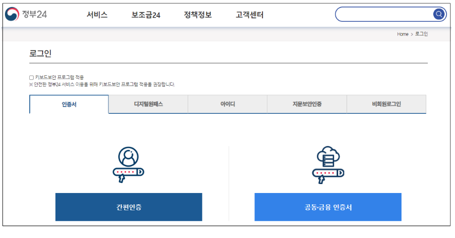 간편 인증 또는 공동, 금융 인증서 중에 편하신 방법으로 로그인을 해주세용.