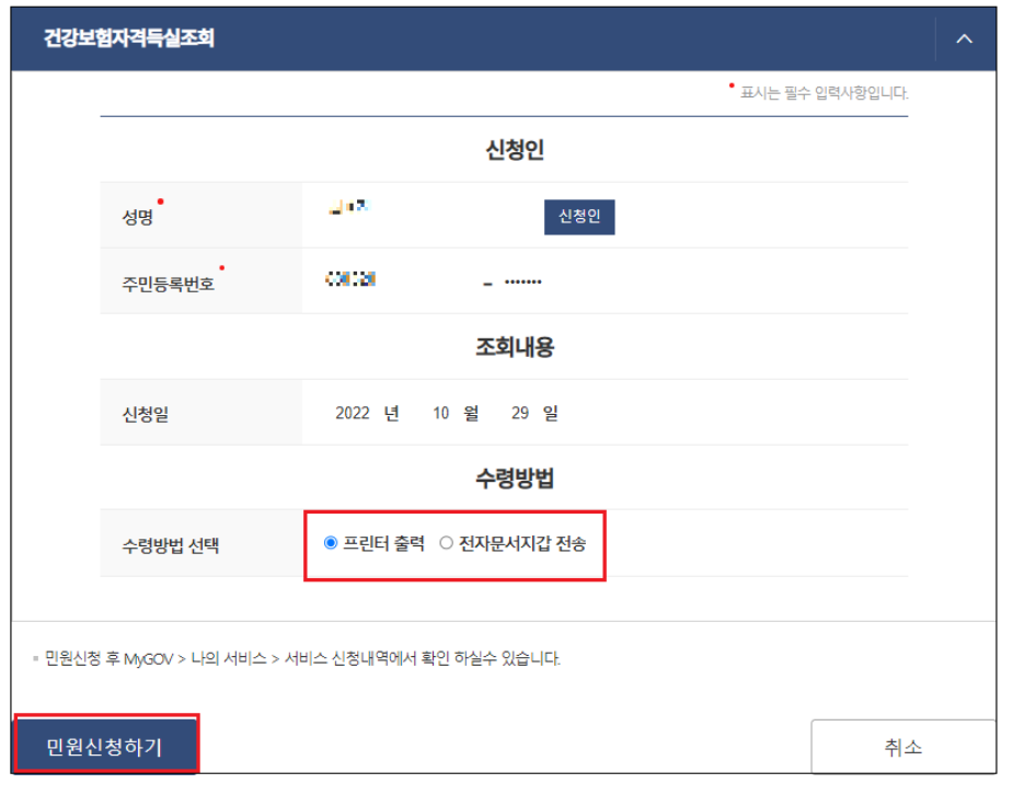 수령 하시는 방법은 프린터 출력을 하셔도 되고, 전자 문서 지갑 전송을 하셔도 되세요.
