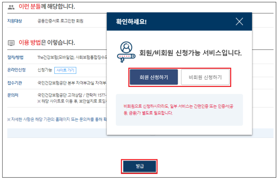 발급을 누르면 회원 또는 비회원 신청하라는 팝업창이 뜨게 됩니다.