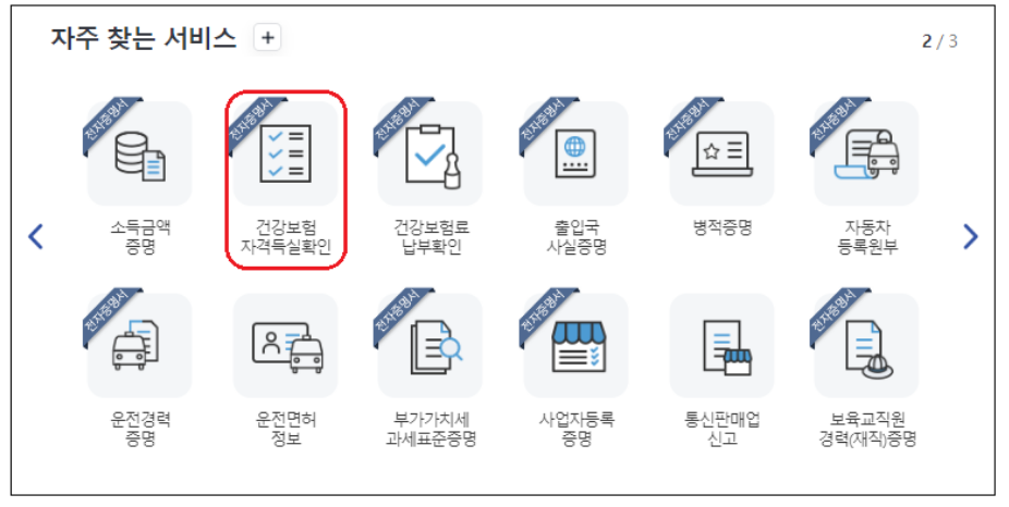 메뉴에서 건강 보험 자격 득실 확인 메뉴를 눌러주세요.